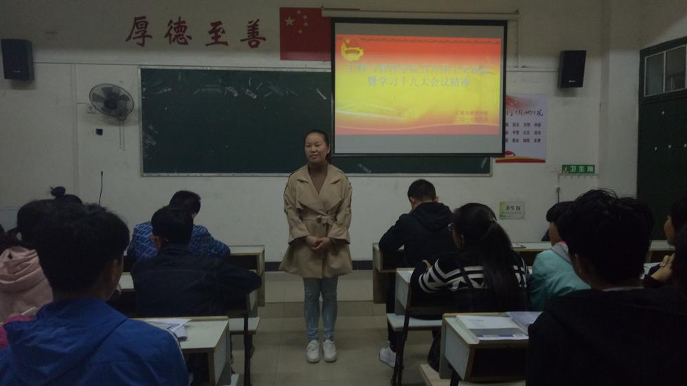 首先,由主持人万欢福点到考勤,提出请假规范问题,同时,鼓励各团干发挥模范作用积极微信投票及转发微信。其次是学生党支部宣传委员刘涛阐述“入党申请书”的相关事务。紧接着是系学生会副主席李文杰详细地说明寝室卫生例检和抽检的流程;系学生会网络信息部干事陈守双发动各团干推送身边的好人好事;系学生会记者站干事乐丽云指出校运动会加油稿的些许不足之处及每月初两篇文学稿任务的下达。再接着,主持人万欢福下达10月18日当天组织各班同学观看十九大会议相关直播或重播的工作,并要求各班同学于18日晚12点之前交上不少于500字的观后感,同时强调微信公众号关注问题,统计微信正能量转发情况。最后,团总支书记朱敏对团干工作内容进行总结以及本学年工作的计划安排,提醒各位团干在气候多变的萍乡学院中注意身体,说明团干对一个集体的重要性。会议在有序温馨的气氛中圆满结束。