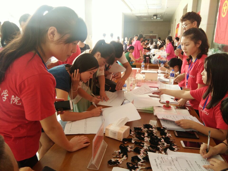 工管学院的学生干部及志愿者们分为接待组、后勤保障组、咨询组,分别接待新生,帮忙搬运行李,帮助新生顺利完成报道工作,并积极解决新生遇到的各种问题。9月8日,早在清晨6点,15、16级学长学姐就已经在会场准备当天所需物资,7点前所有人员已经到位,随时准备迎接新生。尽管8日这天烈日骄阳,但工作人员和志愿者依旧没有懈怠,面带微笑、满怀热情地去迎接每一位新生。接车引导员在校车到达的第一时间引导新生到工管学院报到处前台报到,并带领家长到休息区,给他们递水喝,忙完各种手续以及体检报告后,学长学姐帮新生拿行李送她们去宿舍。报道期间,团总支书记朱敏对迎新工作进行了视察指导,为学生家长解答疑惑,使迎新工作更高效有序地进行。这使他们感到了来自领导、老师、学长学姐的亲切关怀。