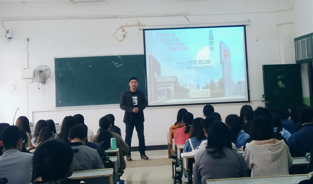 2017年10月20上午16数教2班班主任晏少辉老师及全班同学在英华楼 3407 召开了“早餐门外走,书香心中留;垃圾不落地,校园更美丽”主题班会。