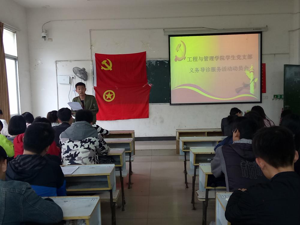 为提升党员服务大众的理念,2017年4月21日12:30,工程与管理学院学生党支部在英华楼3204教室召开了义务导诊服务活动动员会。出席本次会议的有学生党支部副书记冷俊杰、曾季萍以及各班预备党员和入党积极分子,本次会议由冷俊杰同志主持。