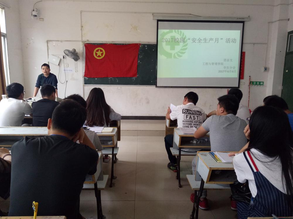 为加强学院学生的安全,提高自我保护意识。2017年6月6日中午,工程与管理学院举行2017校园“安全生产月”活动,出席本次活动为全院学生干部。此次活动由党总支副书记汤中友主持。