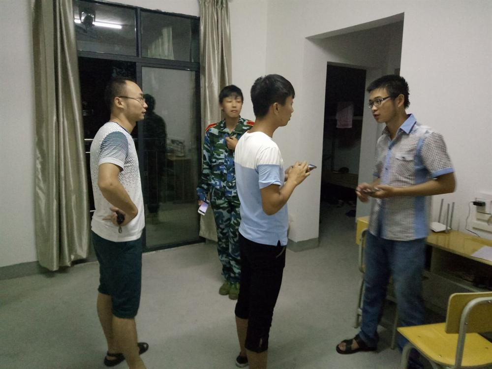 来到寝室,老师首先了解了同学们的到校入住与有空床的寝室情况,尽量了解原因并且取得联系,确认是否能尽快安全到校。再者就是关注寝室里的安全问题,如有使用大功率电器的寝室,老师或提出意见且再三嘱咐注意安全用电,并检查了门窗和床铺是否牢固、安全。为防止外地同学到校入住不适应的情况,老师还提出了要时刻关注天气,及时添衣并希望同学们要尽快的适应大学生活。