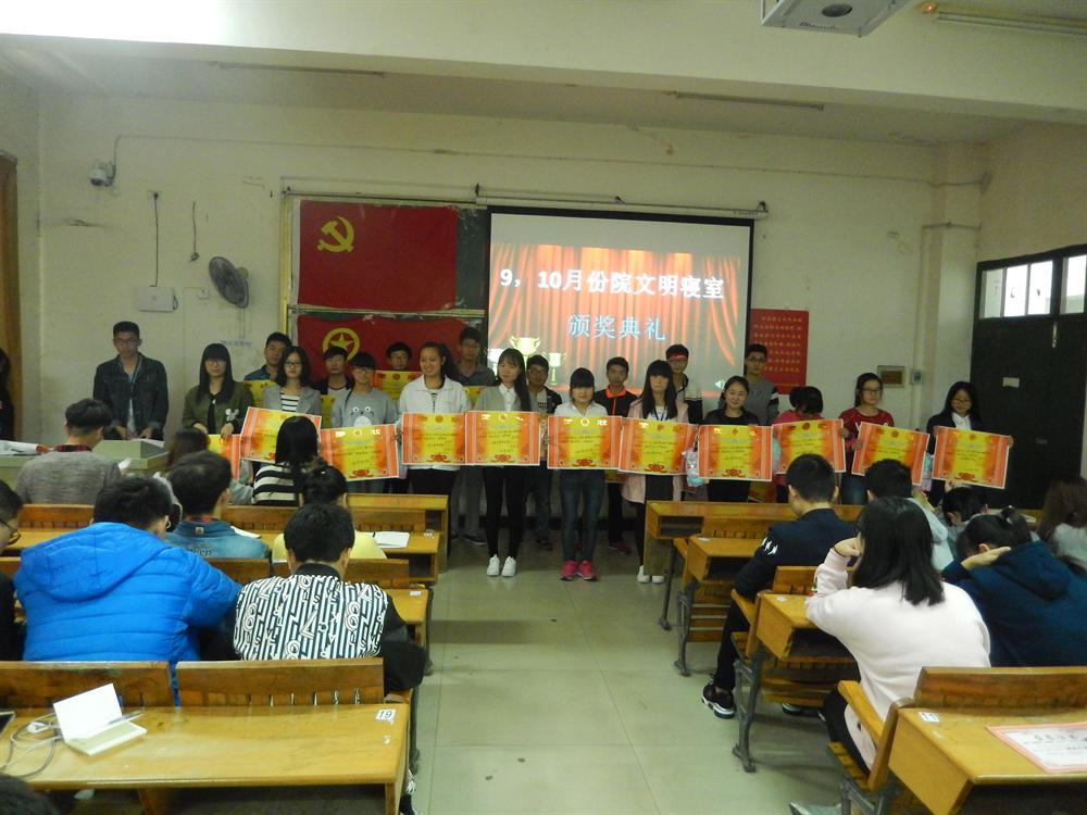 会议伊始,由寝工部干事李远坪和涂金丽分别对上学期寝室管理进行工作总结及本学期工作计划。以上学期为基础对本学期工作提出了新要求,希望在以后的工作中不断改进方法,提高工作效率。紧接着,寝工部各实习干事进行了自我介绍,提出了自己在今后学生会工作的要求及方向,并诠释了为广大学生服务的思想。随后,由我院团总支副书记赵容暄和学生分会副主席李宇分别对我院三、四月份以及九、十月份院系文明寝室进行颁奖并合影留念。最后大会在热烈的掌声中圆满结束!