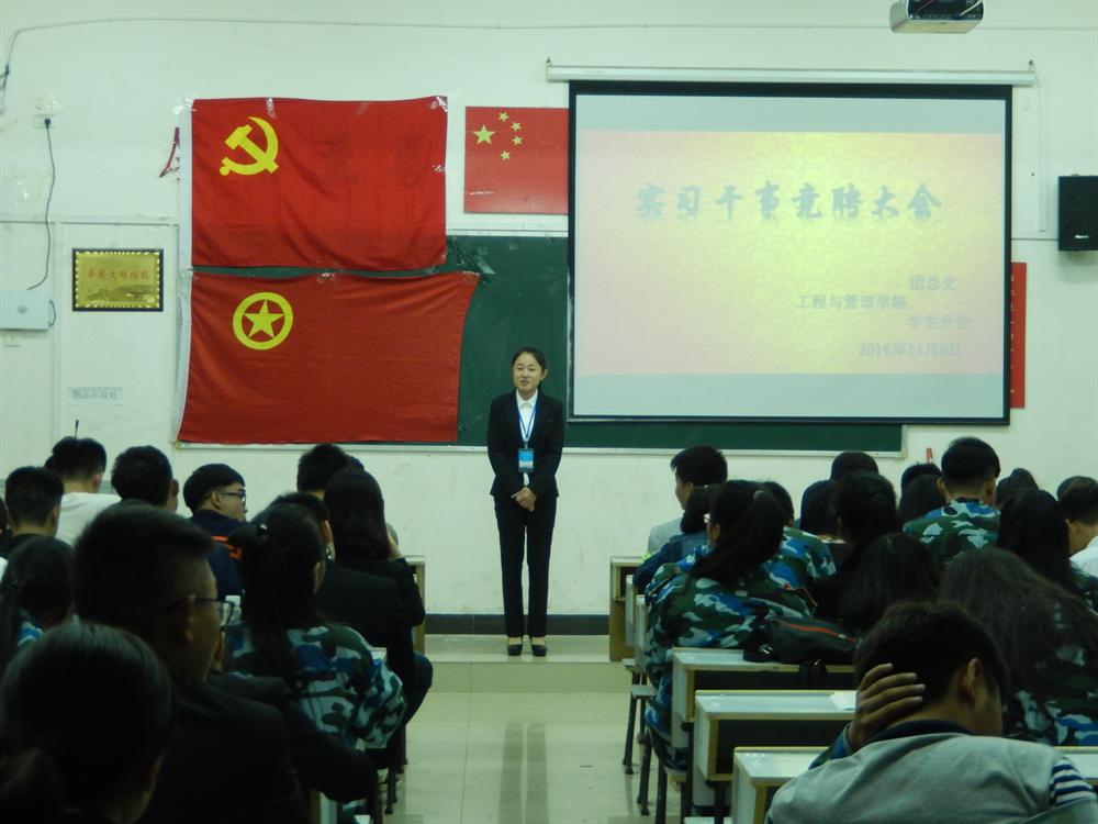 2016年11月6日下午5:30,工程与管理学院团总支学生分会在英华楼3404教室举行2016级实习干事竞聘大会。参加这次大会的有我院学生党支部副书记罗臻、副主席李宇、各部门负责人以及全体实习干事。此次大会由网络信息部干事万欢福主持!