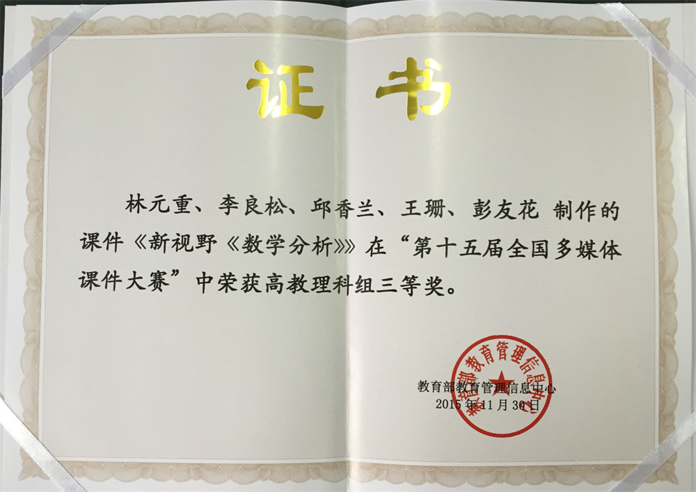 近日,由工程与管理学院林元重、李良松、邱香兰、王珊、彭友花制作的课件《新视野《数学分析》》在