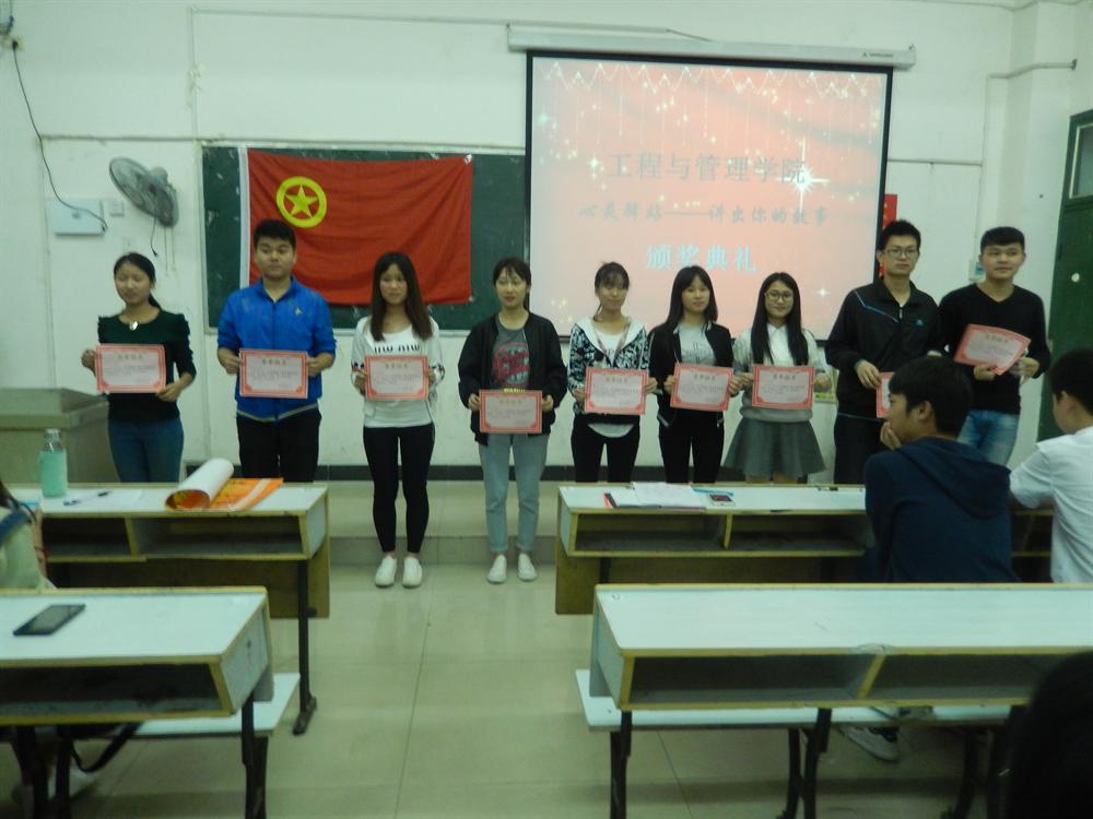 首先,由主持人对到场来宾做了个简单的介绍,活动便正式开始;共有11位选手参加了本次活动,选手们感情真挚,大方的与在座观众分享了自己真实的情感经历,有感动也有泪水,引发了在场所有观众的阵阵沉思。其中一号选手李文欣讲述了自己由自卑转为自信的一个心灵历程,勇敢是每个人所需要的也是必须具备的,一股正能量鼓舞了在场所有观众;而四号选手高梓威则讲述了爷爷与他的童年,回忆总是那么让人怀念,却再也回不去,让在场观众不禁怀念起那些温馨往事。最后,由我院团总支学生分会主席兰玉对选手们的表现做了点评:本次活动中,有的同学在讲台上有点紧张,但他们能够勇敢的站在这里,将故事讲完,就是一种很大的进步。至此,本次活动圆满结束。