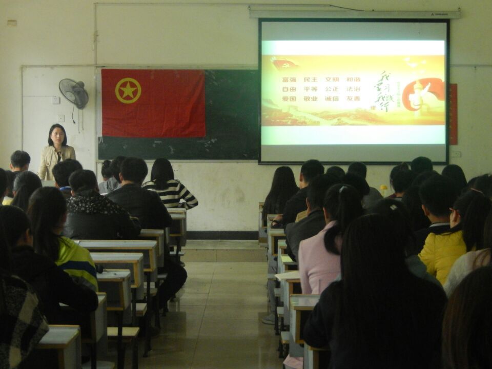 会议开始,全体起立唱“学雷锋”歌。接下来团总支书记朱敏老师讲话,首先她对“学雷锋活动月”的工作内容提出了具体的要求,她强调给团支部应积极开展学雷锋活动动员会,组织开展学雷锋志愿者活动,组建“我是活雷锋”小组开展节约节俭活动,开展系列网络微活动,要求各团支部树立目标努力创建“雷锋班”。接着,朱敏老师对开展主题为“践行社会主义核心价值观,加强大学生基础文明素质”班级辩论赛的活动进行了动员,要求各班组建队伍进行班级比赛,选出优秀辩论队参加学院辩论赛。最后,朱老师将“社会主义核心价值观”从国家层面、社会层面和个人行为层面进行了深入的解释,并以“六尺巷”的故事为例,教会了同学们礼让、宽容等良好品质。
