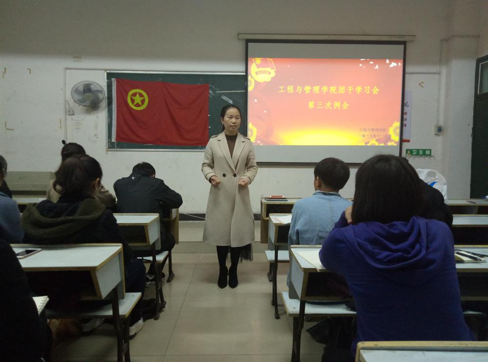 为让学院各团干更加了解自己的职责,更好的提升自己,为班级学院服务,2017年11月29日下午五点,工程与管理学院团干学习会第三次例会于英华楼3309教室召开。出席本次例会的有:团总支书记朱敏老师,记者站干事乐丽云,网络信息部干事陈守双,以及16,17级各班班长,团支书,通讯委员,宣传委员,组织委员。本次例会由陈守双主持。