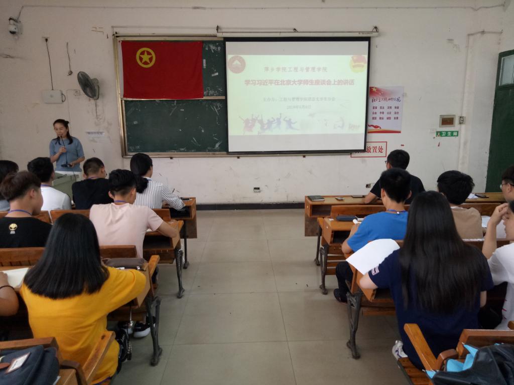 为我院青年学生能更深入学习领会习近平新时代中国特色社会主义思想,切实铭记践行习近平总书记的淳淳教诲,追随感悟习近平总书记的青春奋斗足迹。工程与管理学院于2018年5月8日在英华楼3206举行“学习习近平在北京大学师生座谈会上的讲话”活动,参加此次活动的有工程与管理学院党总支副书记汤中友、团总支书记朱敏、学生党支部副书记唐宇航、团总支副书记乐丽云、团总支学生分会主席罗晓华、书记助理孙淼、陈守双、团总支学生分会副主席武晓旭、钟春春以及全体系干。