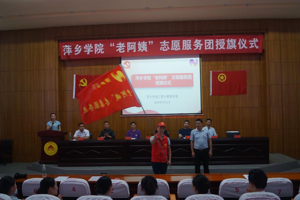 为使我校师生广泛学习龚全珍先进事迹,传承“老阿姨”的红色精神,倡导师生向老一辈革命者、中共党员学习,不忘初心,永葆党员本色,萍乡学院于5月11日14:30在至善楼学术报告厅举行“老阿姨”志愿服务团授旗仪式,活动由工程与管理学院承办。出席本次授旗仪式的领导和嘉宾有校党委委员、副书记蔡宝琦,校党委委员、宣传统战部部长陈永国,莲花中学副校长、莲花县委派驻甘祖昌干部学院负责人朱元戎,团省委组织部兼职部长、萍乡城事网总经理李剑科,工程与管理学院党总支书记刘根林,萍乡市安源纪念馆副馆长贺卓,团市委兼职副书记、安源纪念馆宣传科科长田金河及4名安源纪念馆讲解员等,出席此次仪式的有工程与管理学院全体党员教师及志愿者代表。仪式由工程与管理学院分团委书记朱敏主持。