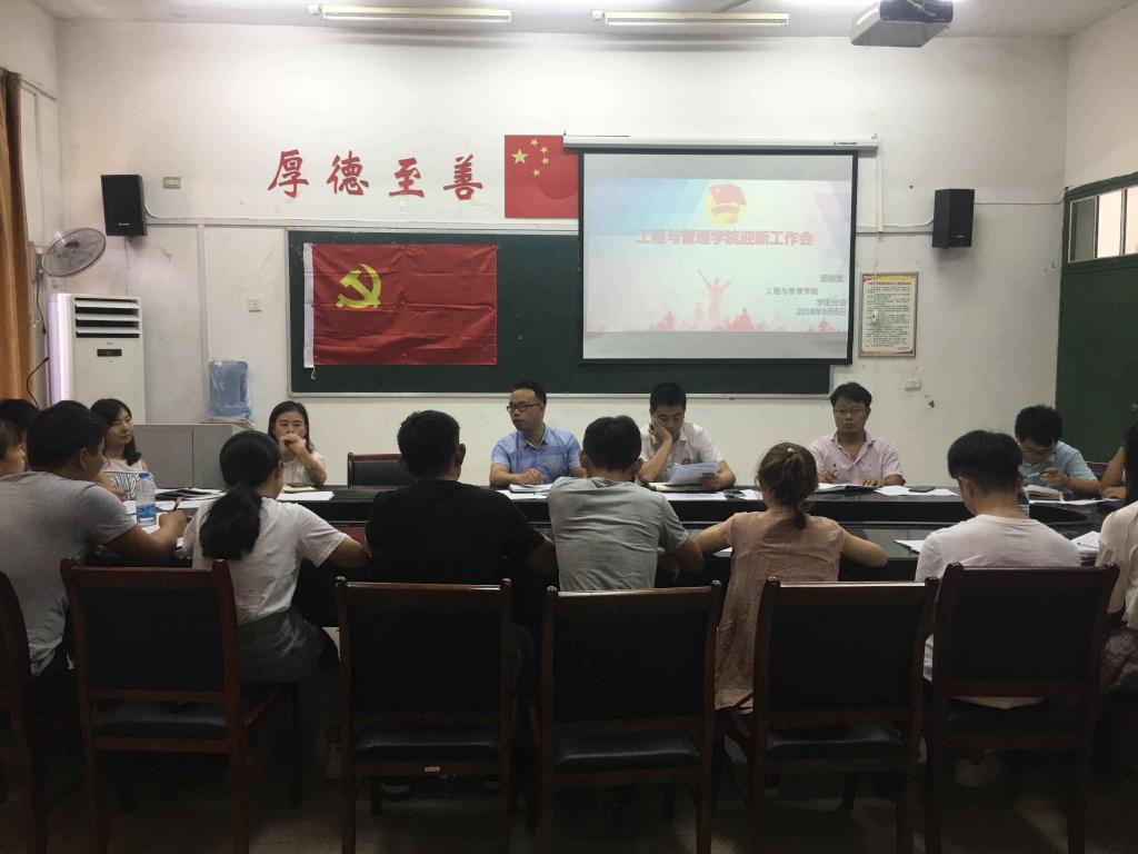 会上,党总支副书记汤中友介绍新生班各班班主任,并向在会人员宣读我院迎新工作安排及注意事项。汤书记重点强调迎新时要注意时间安排,迎新工作要做到具体化,全面化。随后辅导员晏少辉老师介绍了新生寝室分布及寝室卫生内务要求,并要求学生干部在面对新生及家长对寝室的相关疑问时能耐心详细解答。团总支书记兼18级辅导员徐洁老师为各班助理辅导员进行工作培训,以便更好地协助班主任完成各班工作,帮助新生完成角色转变,适应大学生活。并要求各助理辅导员与班主任紧密沟通联系,努力做到开学前就树立好一个有优良品学的班风班貌。最后我院副院长彭友花对会议了补充和总结,彭院长强调了此次接新工作的重要性,要求每一位接新人员都要认真负责完成接新工作,迎新过程中一定要校对好新生资料,确保每位新生都能顺利正常的入学。