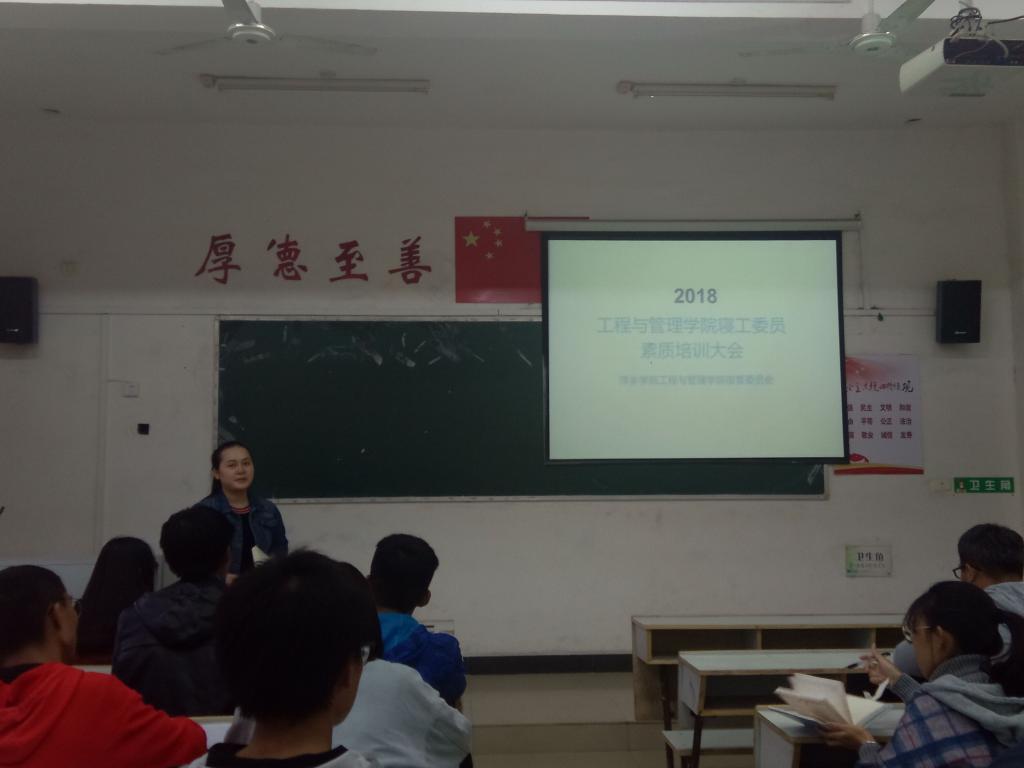 为使我院寝工委员更好地进行寝室卫生督查,为广大同学营造一个良好的生活环境。工程与管理学院于2018年10月15日下午17时40分在英华楼3209举行寝工委员素质培训大会。出席本次培训会的嘉宾为工程与管理学院团总支学生分会主席罗晓华,宿管主任武晓旭。系宿管会全体干事及实习干事、18级班长团支书及寝工委员参加了本次会议,本次大会由系宿管会干事周妮主持。