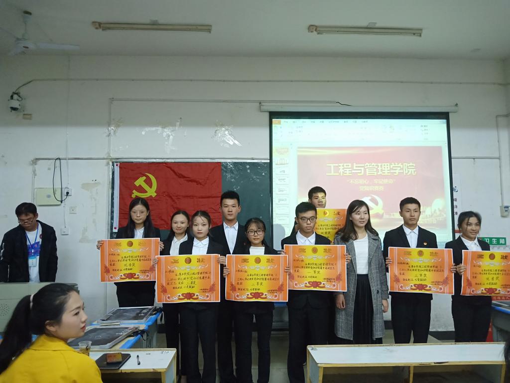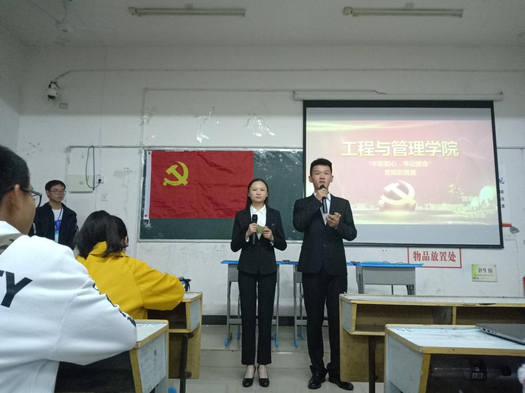 为使我院学生更加了解党史知识,紧跟党的步伐,2018年10月22日19时30分我院于英华楼3204举办“不忘初心,牢记使命”党的知识竞赛。出席本次比赛的嘉宾有工程与管理学院18级辅导员朱婧老师,18数教2班班主任熊学亮老师,18级各班代表队参加了本次比赛。