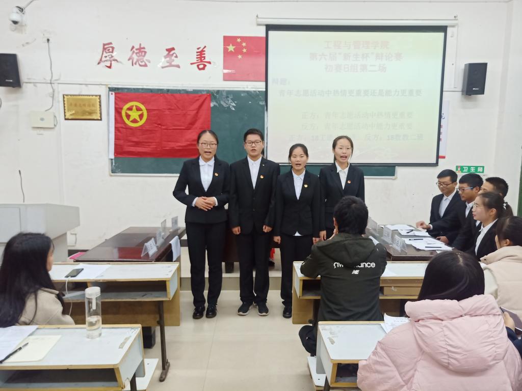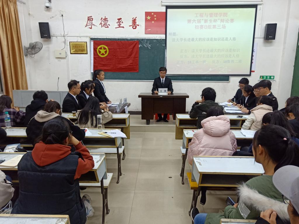 群儒舌战展雄风,争锋相对辩天下。2018年12月5日18点30分,工程与管理学院新生杯第六届辩论赛初赛B组于英华楼3404教室举行。