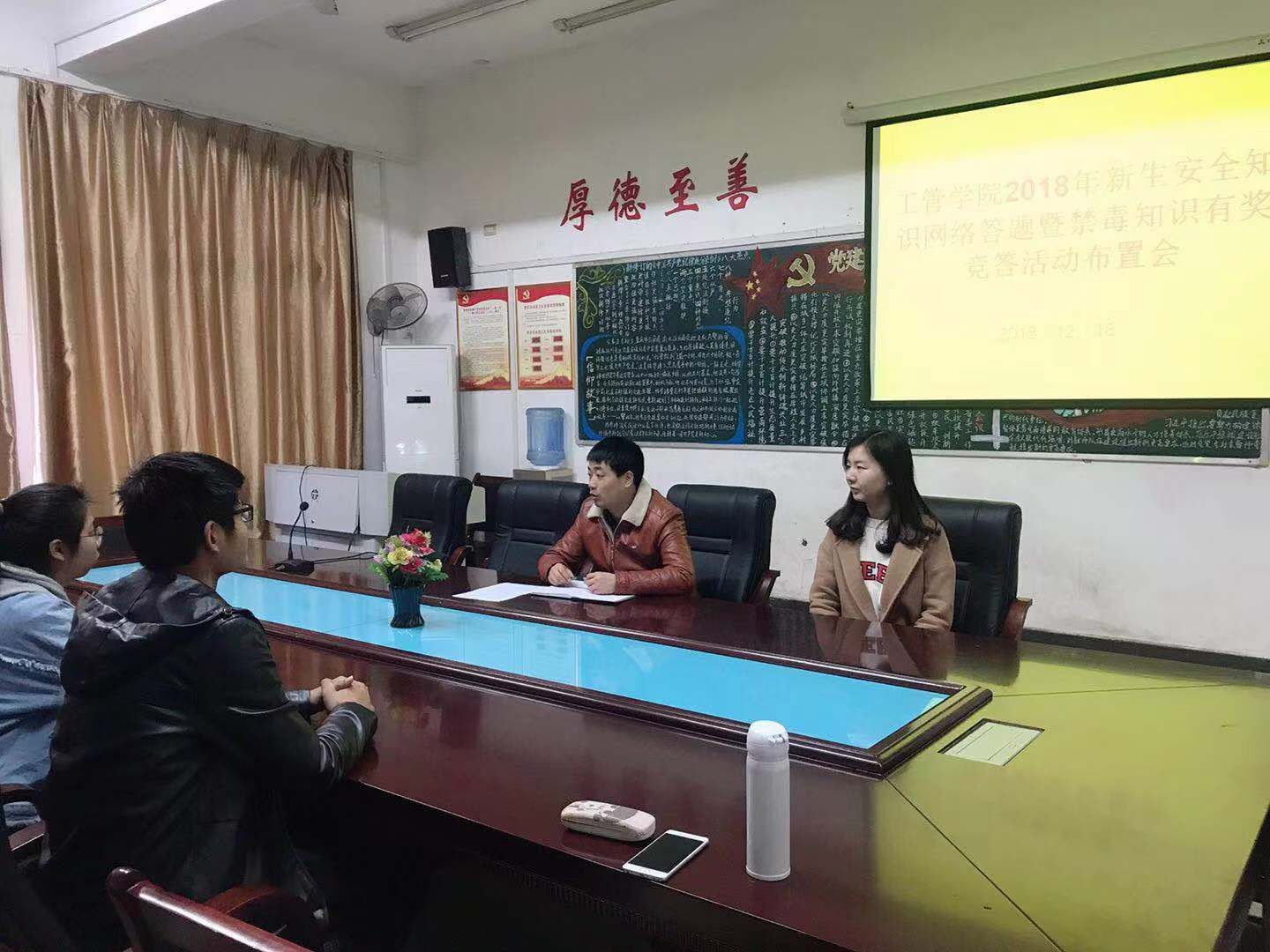 临近年末,寒假放假在即,诱发安全事故的因素进一步增多。为了增加学生的安全意识和能力,工程与管理学院于2018年12月18日召开岁末年初安全工作暨18级新生安全知识网络答题工作布置会,参加会议的有学院党总支副书记汤中友、辅导员徐洁及各班团支书,会议由辅导员朱婧主持。