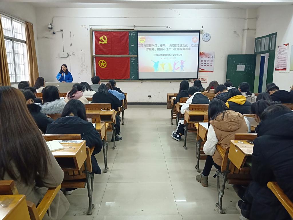 为响彻中共中央办公厅,国务院办公厅印发的《关于实施中华优秀文化传统发展工程的意见》,工程与管理学院2018年12月25日于英华楼3206召开了传承中华民族传统文化,拒绝崇洋媚外,提倡不过洋节主题教育活动。参加本次会议的人员有学生党支部副书记王安佳及全体工程与管理学院团总支学生分会全体成员。