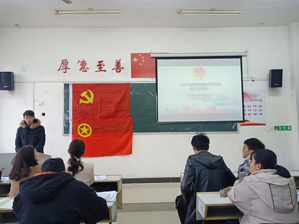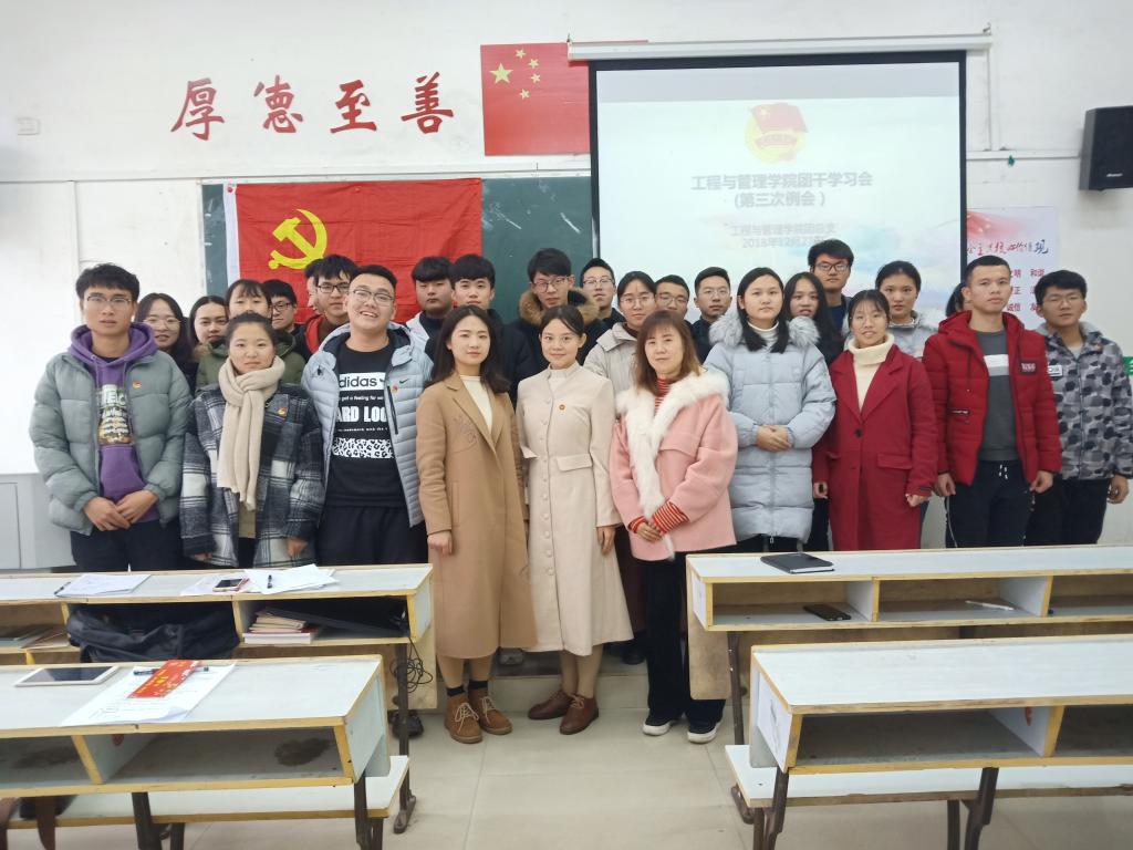 为使各班团干互相交流学习,提升其自身工作能力,更好的为班级、学院服务。2018年12月27日中午12时40分,工程与管理学院于英华楼3209教室召开了本学年第三次团干交流会,出席本次会议的嘉宾有工程与管理学院18级辅导员徐洁,非毕业班各班班长团支书参加本次会议,本次会议由团支部副书记万梓言主持。