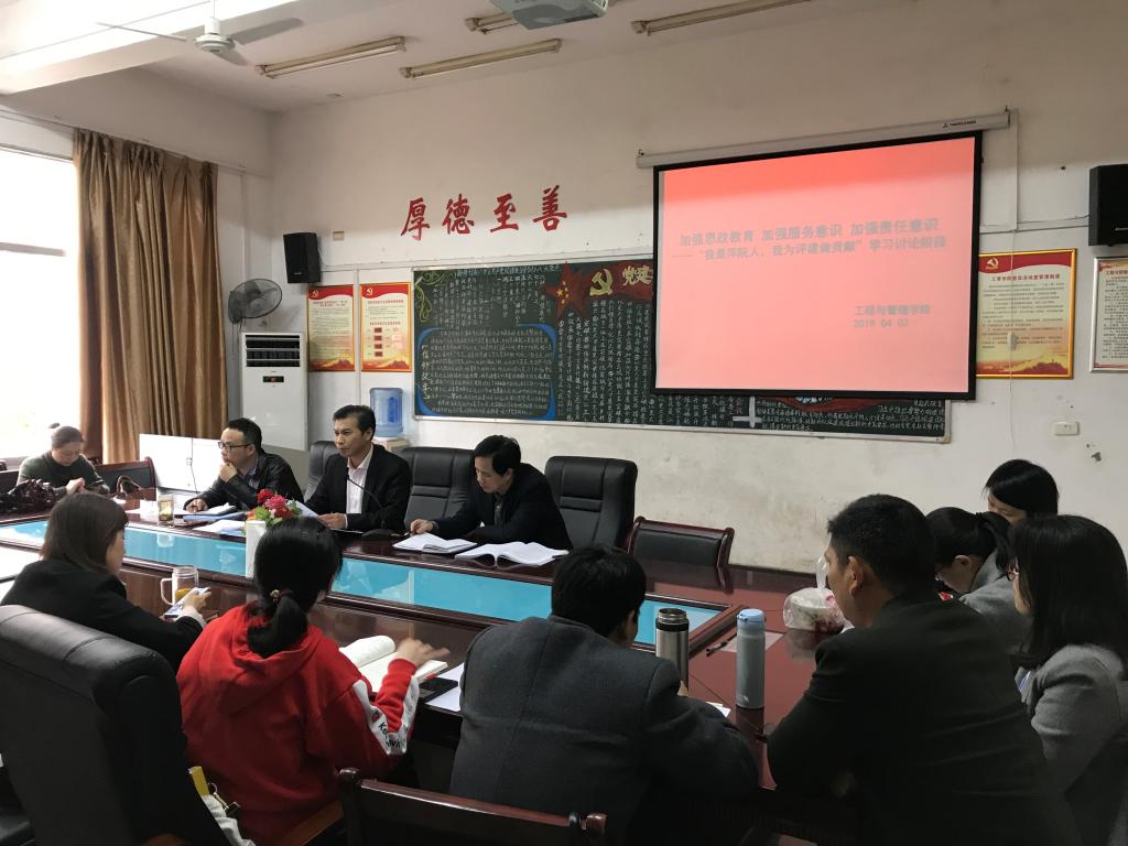 为深化认识,齐心协力做好本科教学评估工作,根据学校《关于开展“我是萍院人,我为评建做贡献”主题活动实施方案》要求,工程与管理学院于2019年4月2日在英华楼3229会议室开展“加强思政教育 加强责任意识 加强服务意识——我是萍院人,我为评建做贡献”学习讨论,学院全体教职工参加会议,会议由学院党总支书记刘根林主持。