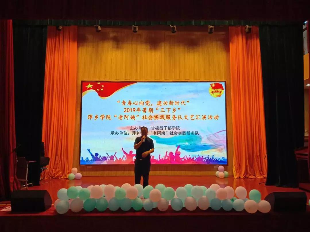 为贯彻落实“青春心向党,建功新时代”的社会实践宗旨,展现队员们活力四射,积极向上的精神面貌,同时展示此次社会实践工作的成果,“老阿姨”社会实践服务队于2019年8月14日15时在甘祖昌干部学院培训楼101教室举办2019暑期“三下乡”文艺汇演。
