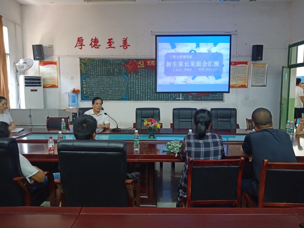 为加强学校与家长的交流沟通,增进家长对学校工作的了解,2019年9月7日中午13点30分,工程与管理学院于英华楼3229召开2019级新生入学家长见面会。