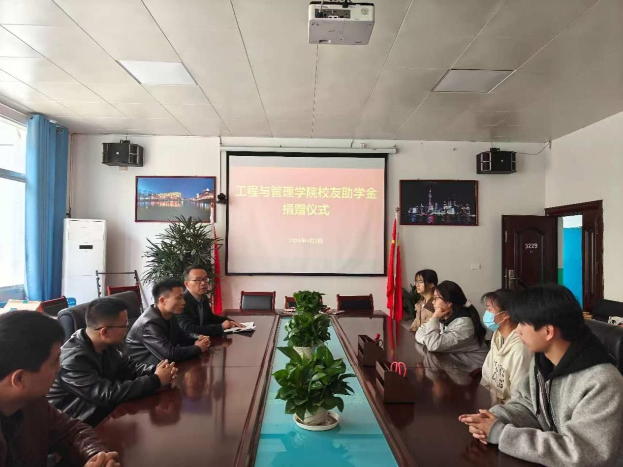 2025年4月2日下午,工程与管理学院校友助学金捐赠仪式在学院会议室隆重举行。仪式由学院党委书记彭友花主持,两家校友企业——江西同晟项目咨询管理有限公司(09届工程造价毕业校友)和深圳大宇运通国际货运代理有限公司(08届数学与应用数学毕业校友)代表返校捐资助学,向4名家庭经济困难学生捐赠共计16000元助学金,以爱心行动回馈母校,传递社会温暖。