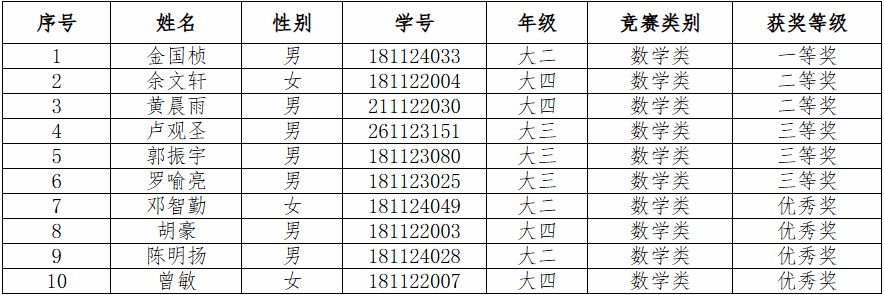 根据竞赛规则和个人成绩,该次竞赛共评选出数学类一等奖1名、二等奖2名、三等奖3名、优秀奖4名;非数学类一等奖4名、二等奖9名、三等奖16名、优秀奖19名。具体获奖名单如下: