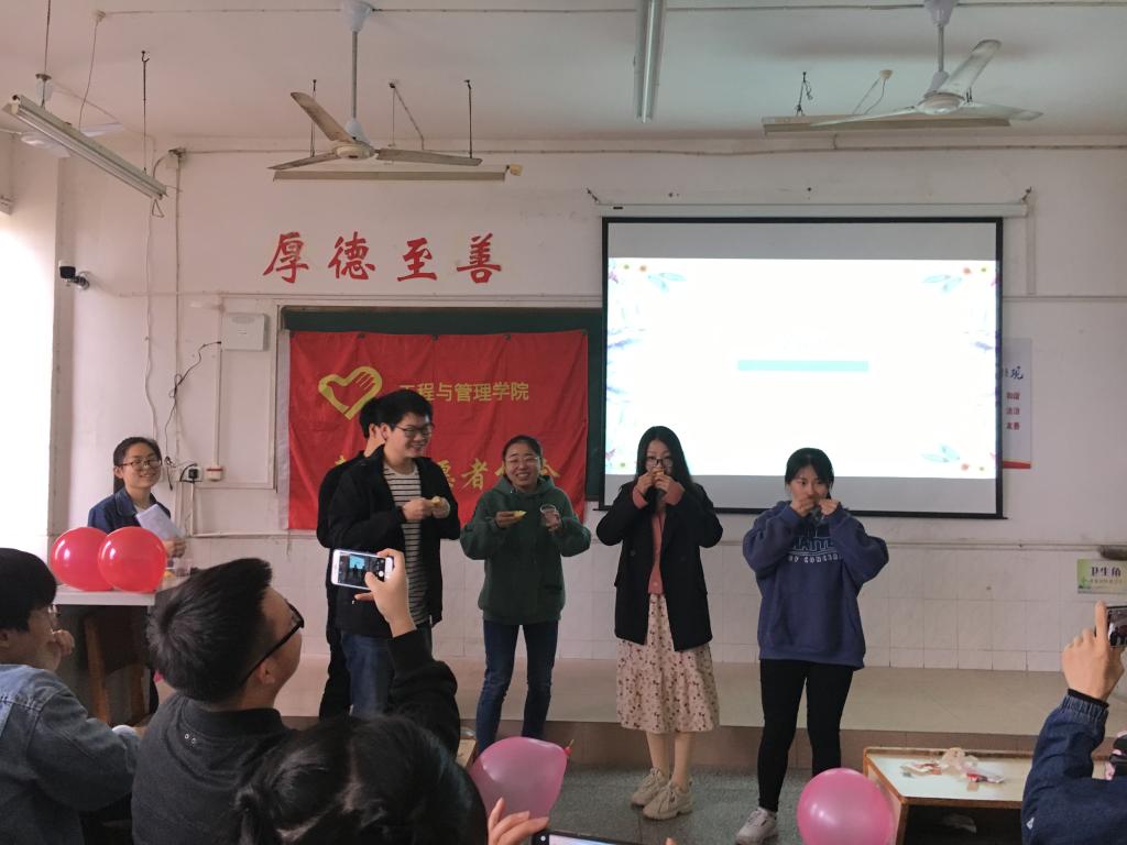 2019年4月13日下午一点三十分,工程与管理学院管青年志愿者协会在跬步楼1406教室开展室内素质拓展活动。