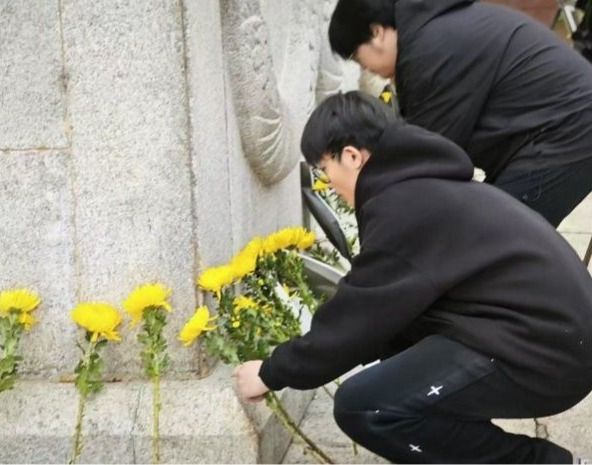 默哀结束后,学院党委书记彭友花和团委书记肖可成缓步上前,将精心准备的黄白菊花花篮敬献于纪念碑基座前。洁白缎带上“革命精神永垂不朽”的金色大字在晨光中熠熠生辉。随后,学生代表手持菊花依次献花,每朵鲜花都凝结着新时代青年“请党放心,强国有我”的青春誓言。现场师生凝视着镌刻烈士姓名的纪念碑,在《献花曲》的旋律中完成了一场跨越时空的精神对话。