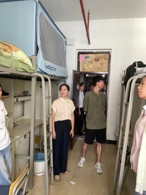 在走访中,陈虹院长与新生亲切交谈,仔细查看宿舍水电、空调及上床下桌的安全细节,叮嘱学生要增强安全意识和防诈骗意识。她勉励同学们尽快完成“三个转变”——从中学到大学、从个人到集体、从被动到主动,尽快适应大学生活。