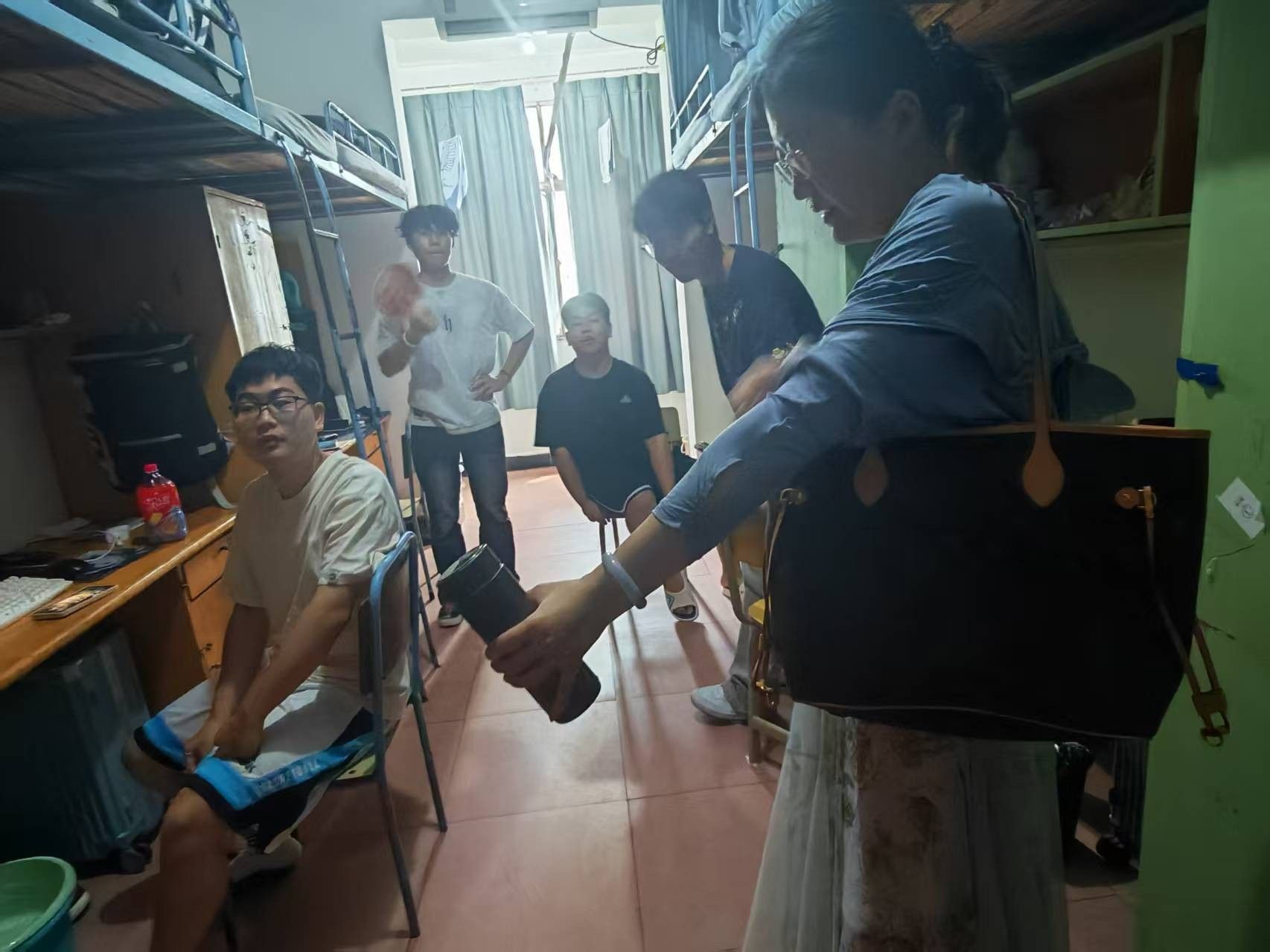 走访中,班主任查看宿舍居住环境,询问大家的生活适应情况,同时提醒同学们注意用电安全、保持宿舍整洁,营造良好的住宿与学习氛围,为接下来的大学生活做好准备。